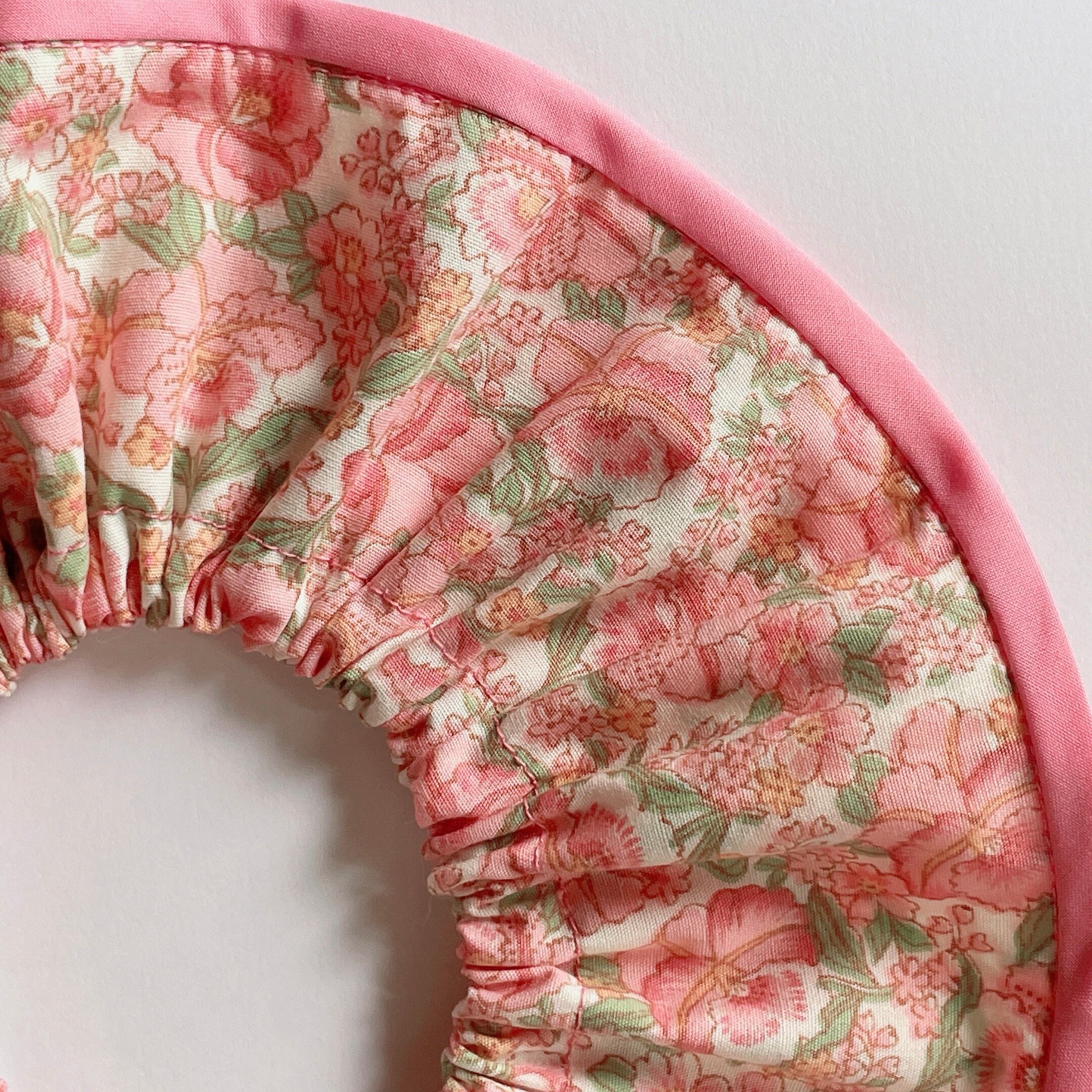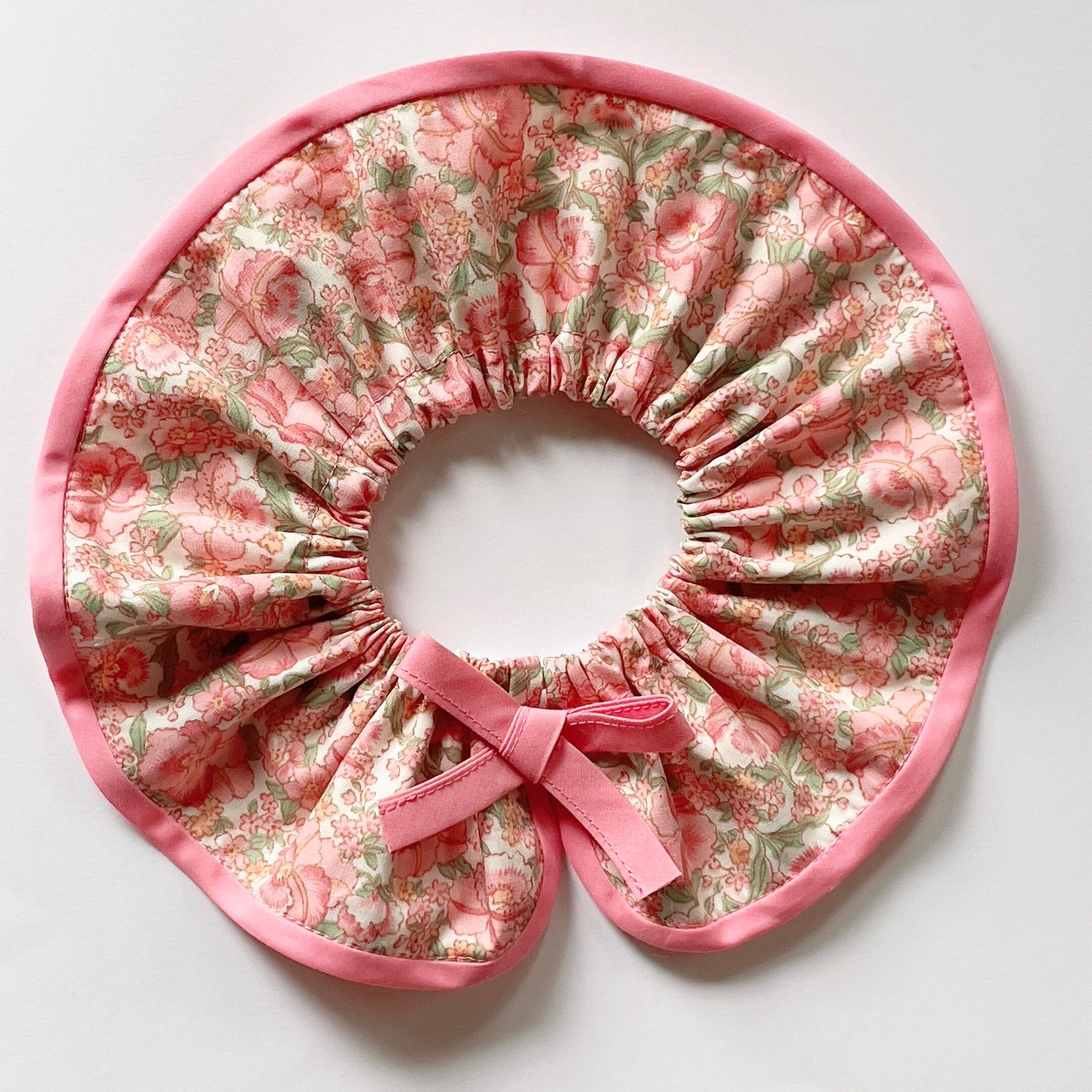ピンクがかわいい花柄地を丸襟風にし