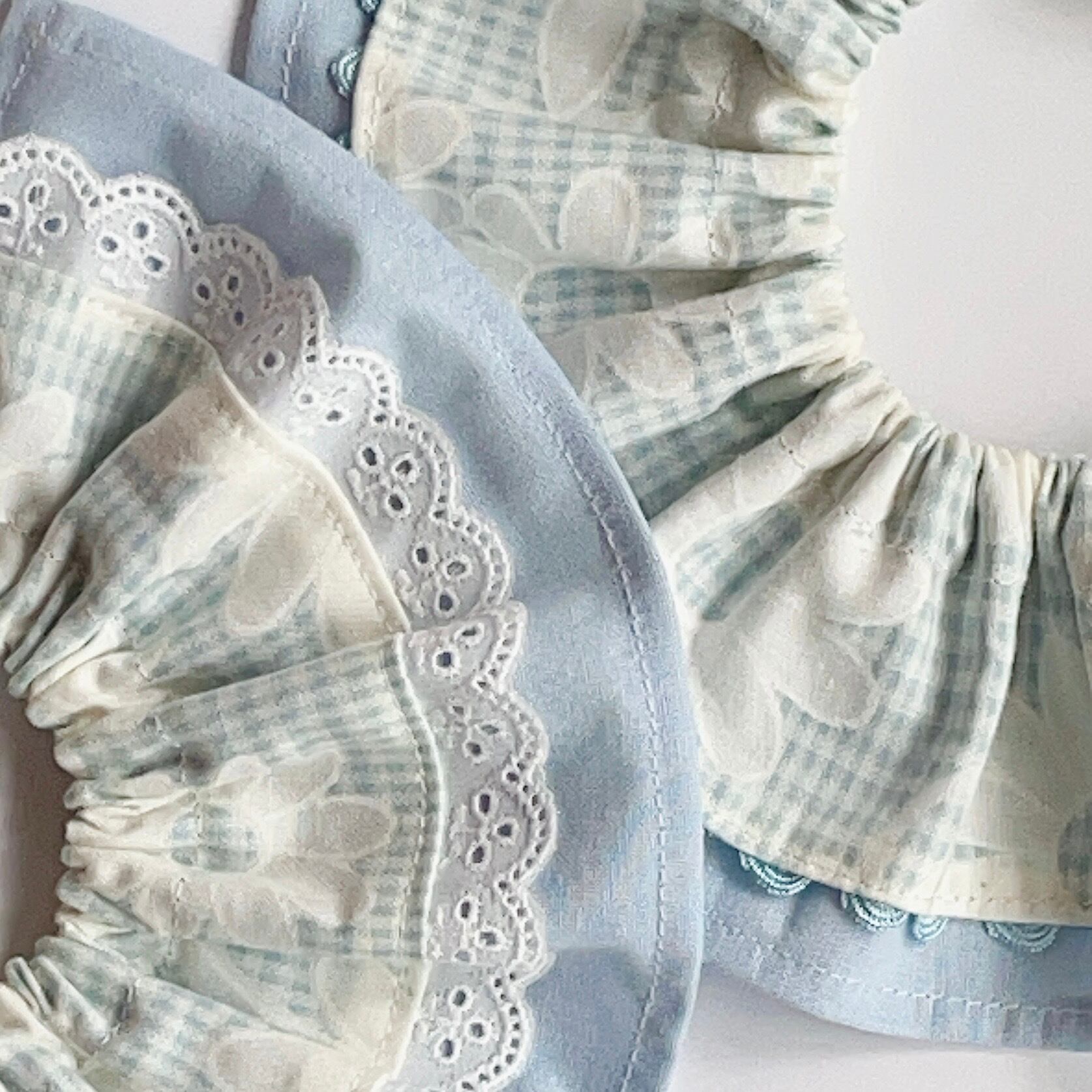花チェック×なみなみレース×水色生地