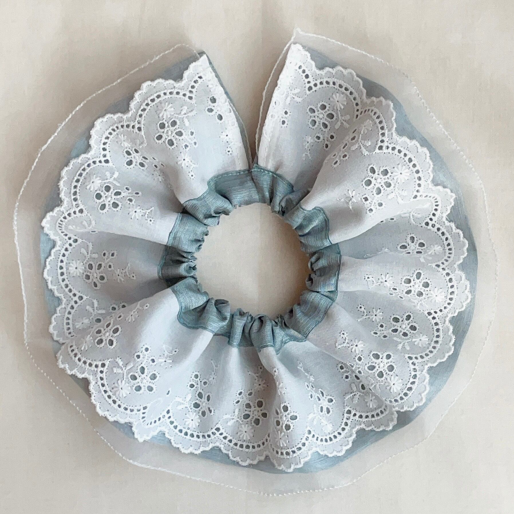 くすみブルーとハリのあるシアー生地に、幅広コットンレースを重ねたとてもオシャレでかわいい一枚です.ᐟ.ᐟ