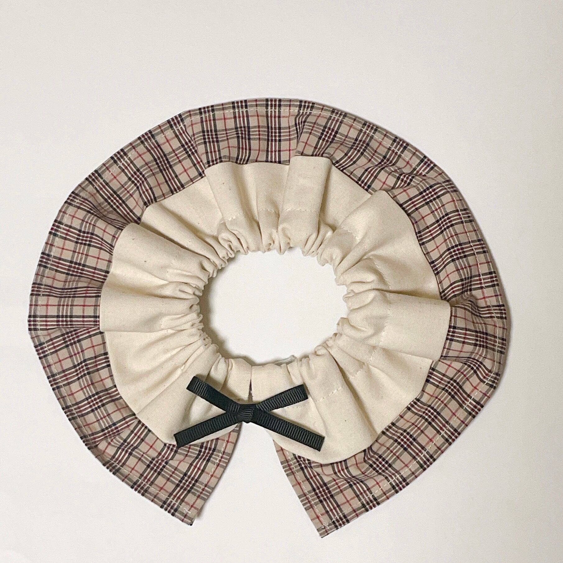 丸襟とチェックをレイヤードで。ベージュでまとめたかわいい一枚です。